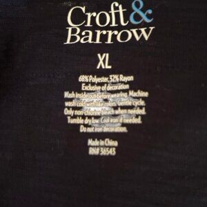 This deep navy tear from Croft and Barrow boasts a detailed boatneck neckline with embroidered balls running across the front and back and down the caped sleeves. The fabric is a very soft Rayon/Polyester blend and drapes nicely in the front with a twisted hem for that tucked in look. EUC