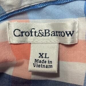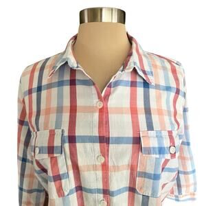 Croft & Barrow Plaid Button Down Short Sleeve Shirt Womens XL 100% Cotton Casual. Three-quarter length roll tab sleeves. White with blue, red, and peach plaid. Two patch pockets. Rounded hem. In excellent preowned condition.