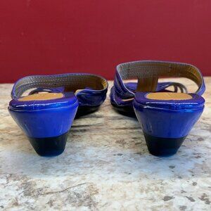 Grape Purple in a faux patent leather makes a statement. Croft & Barrow sole (sense)ability low heeled strappy sandal/shoe looks great with a summer dress but can carry into autumn with the rich color. Comfortable and fun. Worn only a few times. Great condition. No information on materials (assume man-made). Non-smoking home.