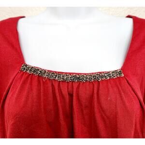 red, silver beading on neck, pleated bodice, square neck, 3/4 sleeves, lightweight, soft, stretchy, flowy