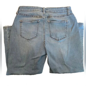 These mid-rise pants feature a straight fit through the hip and thigh, and are designed to hit at the calf. The fabric composition is 72% cotton, 17% polyester, 9% rayon, and 2% spandex.