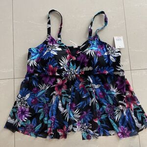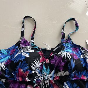 For sale is a brand new Croft & Barrow two-piece tankini swimsuit. The top is size 2XL, features molded bra cups and a sheer mesh fly away fabric piece extending from the bra. The bottom in a generous size L is a short skort. Waist is 19", length is 14". Suggested retail price $33 for top, $33 for bottom.