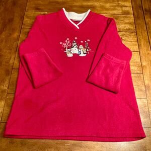 Croft & Barrow Vintage Holiday Snowman Fleece Pullover Top Womens L Red 35.0=R11