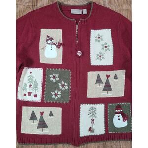 The Croft & Barrow Women's Christmas Zip Cardigan Sweater is a festive and cozy addition to your winter wardrobe. Made from a blend of cotton, nylon, and acrylic, angora rabbit fabric, this tight-knit sweater features a burgundy color with patchwork, embroidery and charming scenes perfect for holiday gatherings. The cardigan has a round neck, long sleeves, and a full zip closure, making it easy to layer over your outfits. Whether you're dressing for a party, casual outing, or workwear, this sweater is sure to add a touch of holiday cheer to your ensemble. In very good condition.