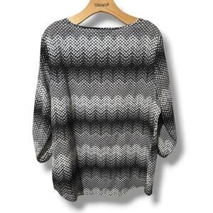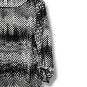🖤 Stylish comfort! Croft & Barrow women’s blouse featuring a chic black-and-gray geometric pattern, roll-tab convertible sleeves, and lightweight polyester fabric. Flattering relaxed fit — perfect for work or casual wear. Size medium, gently used and in great condition!