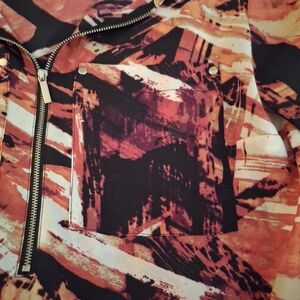 Croft & Barrow women's Vibrant abstract design Blouse. Features a mix of warm tones. Perfect for any occasion. Has roll tab sleeves and front zipper with two breast pockets. Size medium. pit to pit measures 21 inches. Length 26 inches in front and 28 inches in back.