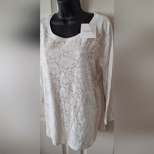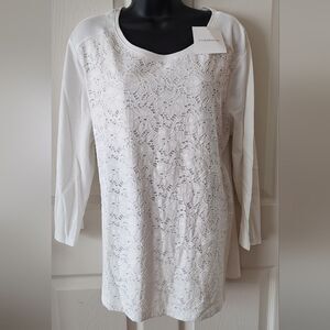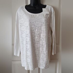 Croft & Barrow XXL White Stretch Cotton Front Lace Panel 3/4 Sleeve Top