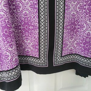 Lightweight and so pretty, this pinkish-purple tunic has a contrasting front stripe and border. Short sleeves and generous, flowy fit.