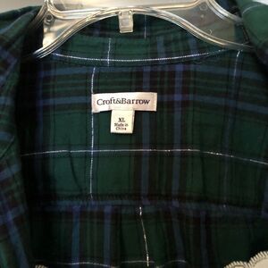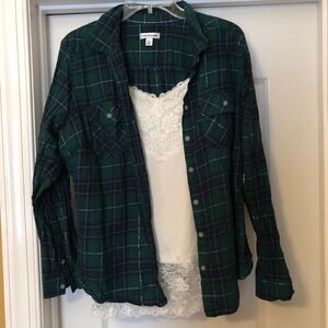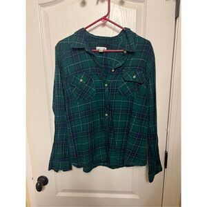 Worn once, very soft, super cute plaid button down. Blue, Green with silver threads colors. Approx measurements across chest 24” length 24”