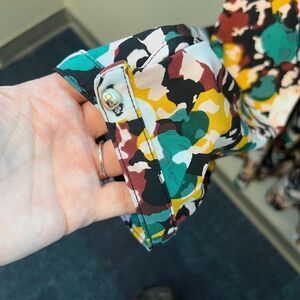 Vibrant floral print top featuring a mix of greens and yellows. Perfect for adding a pop of color to your wardrobe. Some wear on the buttons on the sleeve, otherwise in great shape!
