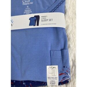 Croft & Borrow 2-Piece Pajama Set Top Pants Short Sleeve Blue Fireworks Cotton, pockets on sides pants, see pictures for more details. The Croft & Borrow 2-Piece Pajama Set includes a short sleeve top with a round neckline and drawstring closure, perfect for a comfortable fit. Made from a lightweight cotton blend fabric, this pajama set features a solid blue color with a peace sign pattern, ideal for a relaxing and peaceful night's sleep. The set is machine washable and designed for year-round wear, making it a versatile addition to any woman's sleepwear collection. Perfect for those who appreciate a blend of comfort and style in their bedtime attire.