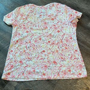 Beautiful and soft! Classic tee, yellow, orange, pink, red and tan floral print. Stretchy! Smoke free home! No rips, holes, tears or stains.