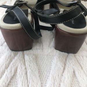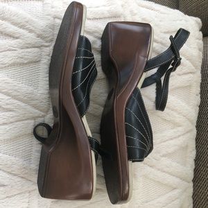Very good,like new condition.Black leather ,Silvertone buckles. 1 1/2 in. soft heels.Insole is padded also.Croft and Barrow made in Brazil leather. Size 8 1/2 M. Very comfy. No scuffs.Slight wedge design. Comfort and style. Fast ship!