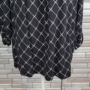 Rayon spandex blend soft stretchy black and white tunic style blouse with 3/4 sleeves, a straight hemline, and a round neckline with gathers in front for a full relaxed fit look. Great pre-owned condition.