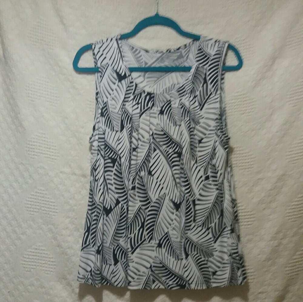 NWOT. Sleeveless, black & white print with gathering at the neckline. Never worn. PXL. I wear 18 to 1X and it fits me. 100% Rayon.