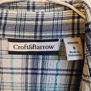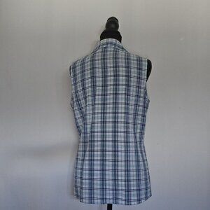 Classic blue and white plaid (or checkered) sleeveless top by Croft&Barrow. Material is a stretch poly, rayon, spandex blend. Has a a traditional collar, and a straight hemline. Size is small.