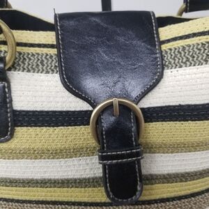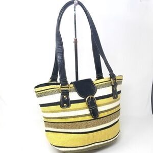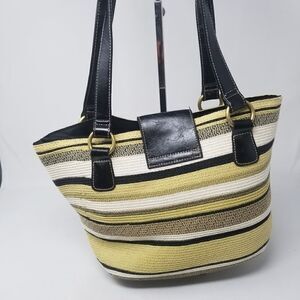 Beige to blacks, neutral tones. New condition. Wiven fabric. Approximately 13 x 8 x 5". Handles approximately 21", not adjustable. Very professional looking bag.