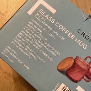 Crofton Glass Coffee Mugs with Bamboo Lid, 10.82 oz. Set of 2, PINK (NEW IN BOX)