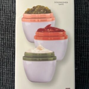 Three compact condiment containers. Features vibrant colors. Screw top lids. Ideal for travel use.