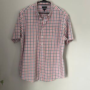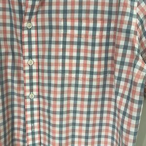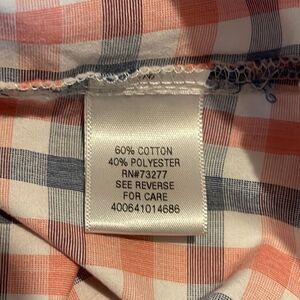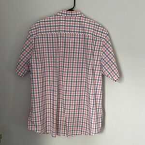 Description: Pink and blue button down. Short sleeve. Easy care. Cotton.
