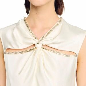 Rhinestone trim, twist detail, and cutouts at front yoke