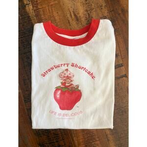 Rare Strawberry Shortcake Life is Delicious T-Shirt Vintage 1990's. Red bands at neck and sleeves. Crisp white background with iconic Strawberry Shortcake design