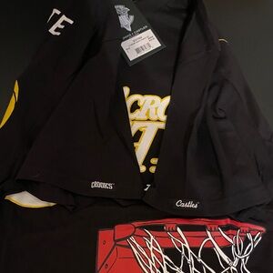 Bold black tee with striking yellow and white graphics. Features Crooks & Castles logo and basketball design. Super cool graphic tee and great for lakers fans or fans of basketball or people that still rock with Crooks and Castles. This shirt is actually super soft and if it don’t sell I may be just keeping it.