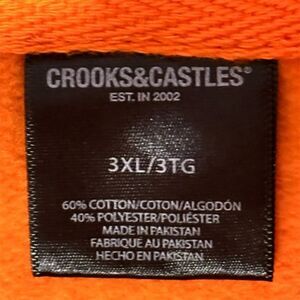 Keywords: Crooks & Castles, hoodie, orange, pullover, fleece, graphic print, men's fashion, casual wear, fall clothing, comfortable fit, drawstring hood, kangaroo pocket, ribbed cuffs