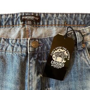 Crooks & Castles jeans, distressed men’s denim, streetwear jeans 42x30, baggy fit jeans, urban fashion jeans, NWT Crooks denim, washed blue jeans, men’s 100% cotton jeans