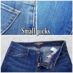 Dark wash stretch denim w/ factory fading, sanding, whiskering. 5 pocket, button/zipper fly, cropped ankle length. Minor issues noted in photos. Excellent preowned condition, overall. Size 8 / 29 by Lucky Brand. Style: Lola Ankle Crop