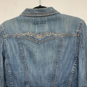 Crop Denim Jacket Woman Medium Y2K Blue Embroidery Beads Boho Western Paris Blue
