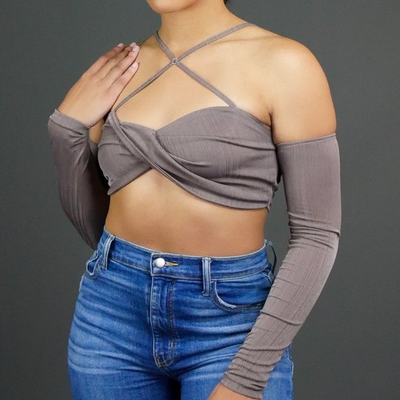 Off the shoulder Crop Halter Top. Model is wearing a size Medium.