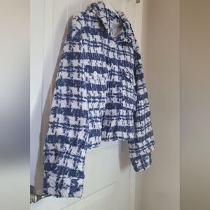Chic and stylish, this blue and white tweed jacket is perfect for any occasion. Its classic design offers a timeless look, making it a versatile addition to your wardrobe.