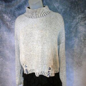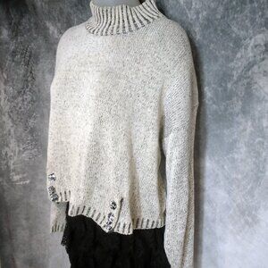 One of my favorites over the decades but I'm on overload so now I have to part with it. No stated size on this but this is extremely oversized and very very drapey! There might even be some rayon in this Cotton Ramie knit. It is a true cropped sweater at 19 inches in length, a wonderful tweeDy pattern of white and black which makes the Whole look Gray with black touches. Ribbed mock turtleneck and cuffs. Dropped shoulders, what more could you want from an 80s item That still works in the 21st century? WILL FIT MANY-(model is size 8)