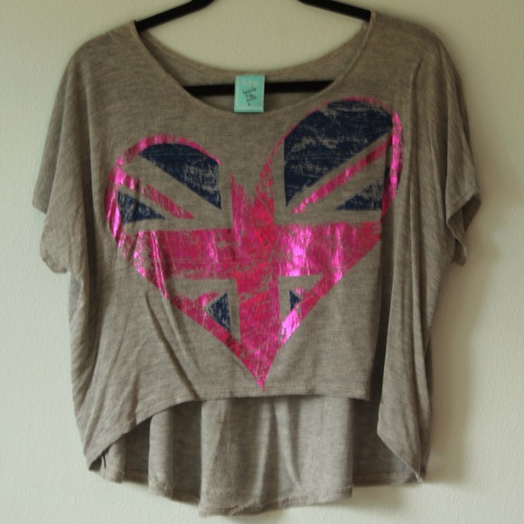 A loose fitting soft grey crop top. It has a big blue and pink heart with the British flag at the center