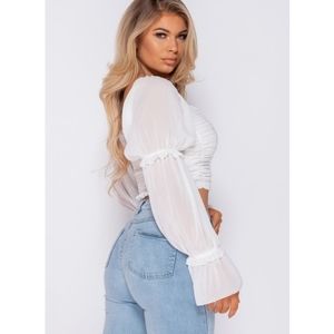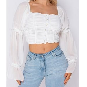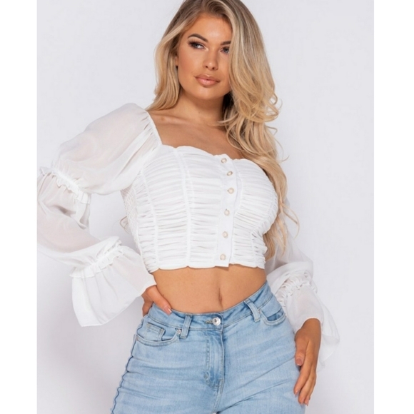Get your transitional collections all stocked up with our range of new season tops. This crop top featuring shirring detail & button up front can be styled with high waist jeans & heeled boots for an effortless chic look!