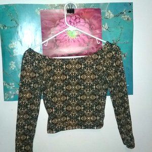 Stretchy 3/4-sleeve crop top with bohemian pattern. Green and gold.
