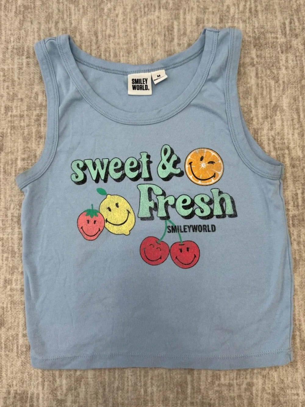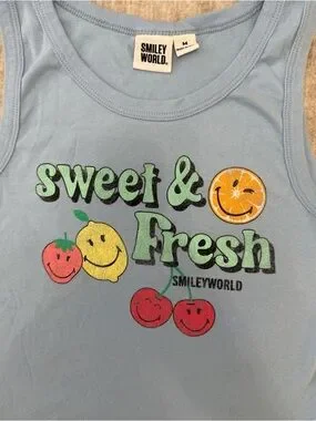 Light blue adorable crop featuring cheerful fruit smiley graphics. Soft, breathable fabric for comfortable everyday play. Bright, colorful print adds playful charm to casual outfits. Fun for spring and summer