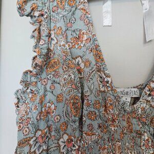Patrons of Peace crop top - light bluish/greenish with orange floral pattern.