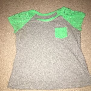 Cute gray and green crop top with rhinestones on the sleeves. Little pocket on the front. Only slightly cropped. Girls size 16 could fit an XS woman. Feel free to make offers/trades!