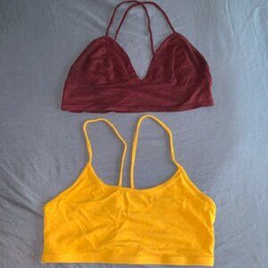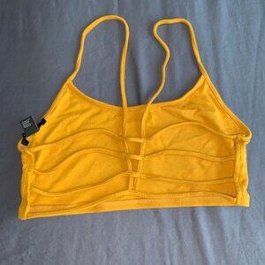 -Back is open with straps that cut across the back (they intersect with the shoulder straps)