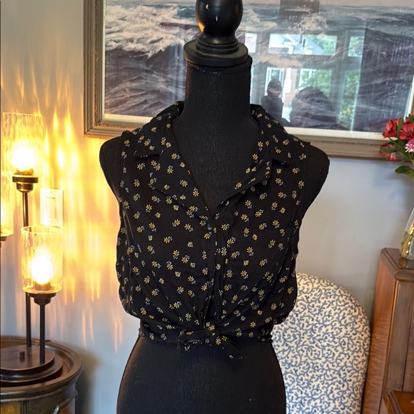 Adorable navy blue daisy sleeveless cropped button down. Can be work without tie. Size medium