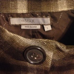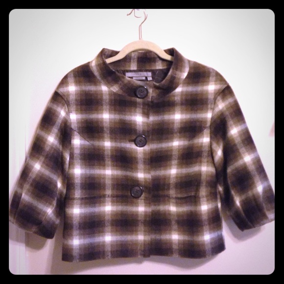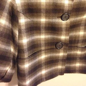 Brown and white crop 3/4 sleeve jacket. Small pockets, darts at bust. 3 large buttons. Fully lined.