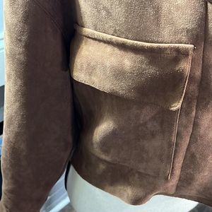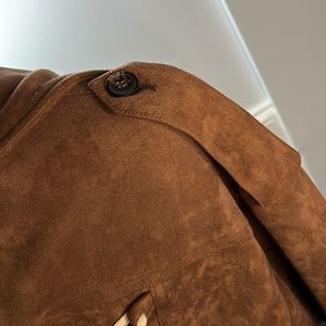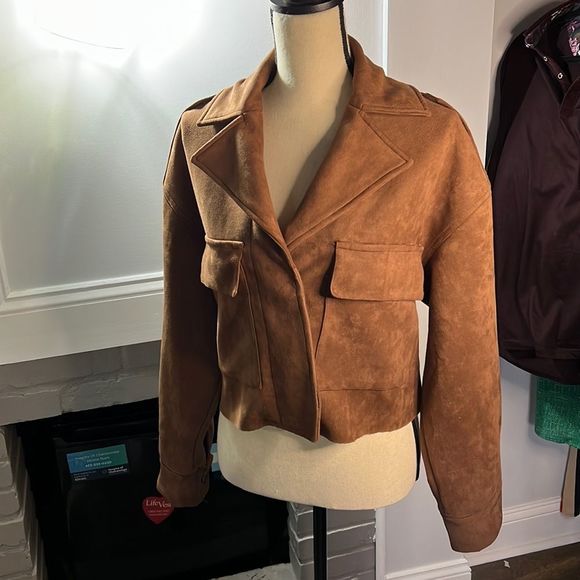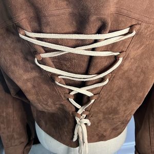 This is a super cute crop jacket with a lace up back! It is brown and feels like suede but it does not have a fabric content tag in it! All buttons are in tact and work appropriately