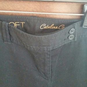 Basic black crop pant with stretch, front button closure, 2 flat button back pockets