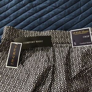 Comfortable black casual crop pants from Verve Blues. Black and white print with a coordinating print detail on lower leg area. Pull-on waist and front pockets Easy Care & comfortable! . I have uploaded the size, content and care label pictures to give detailed info.