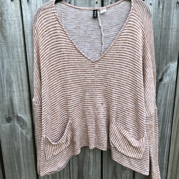 Loose Crop scoop neck sweater, fitted sleeves with pockets. Thin knit. Has on or two barely noticeable thread pulls.