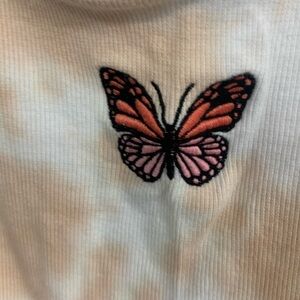 This tank is so cute - I love the embroidered butterfly - the orange and pink accentuates the light brown/creamy white of the shirt. Says it’s a Medium but it’s definitely not. It’s really an XS - 95%\5% cotton/spandex. ***Part of my 2 for $25/3 for $30 deal