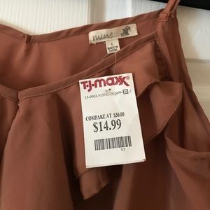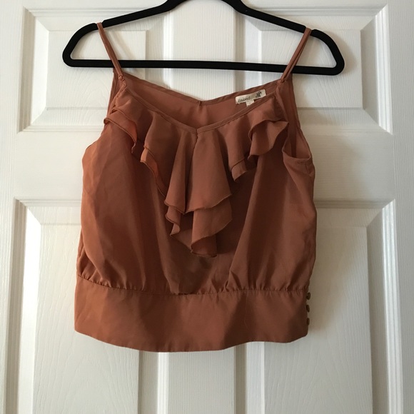 Light brown tank with adjustable straps. Three cute little buttons on bottom left of shirt. Crop topish-short length. Sheer material. Never been worn.
