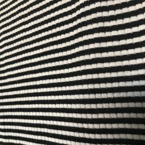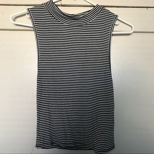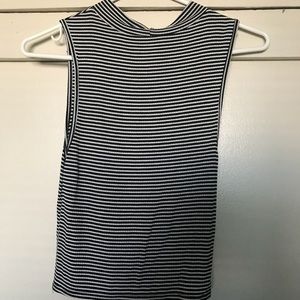 Muscle tee looking crop top with a very small turtle neck. It is striped.. black and white